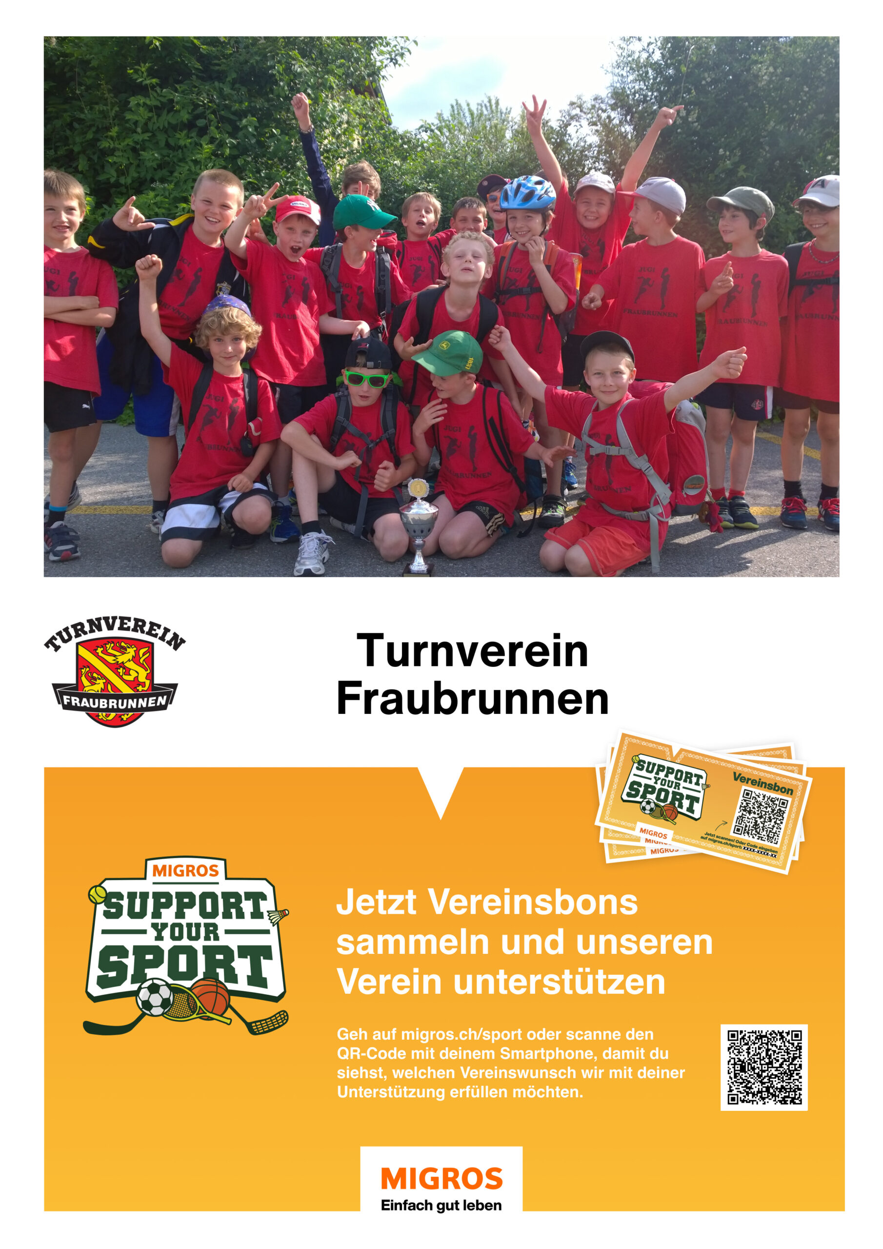 Auch der Turnverein Fraubrunnen ist mit dabei bei der Aktion und sammelt für die Durchführung des Jugi Weekends! Falls ihr regelmässige Migros Einkäufer seid, sammelt also vom 2. Februar bis 12. April 2021 fleissig Vereinsbons und unterstützt die Durchführung des nächsten Jugendriege Weekends!